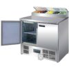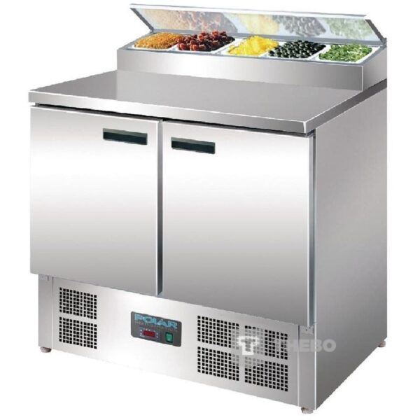 RVS voorbereidingstafel voor salades, pizza’s etc. Voorzien van gekoelde bovenruimte geschikt voor 5 x GN 1/6 bakken tot 150 mm. GN bakken worden niet bijgeleverd. Elke deur heeft een gekoeld GN 1/1 interieur. Zowel inwendig als uitwendig RVS.